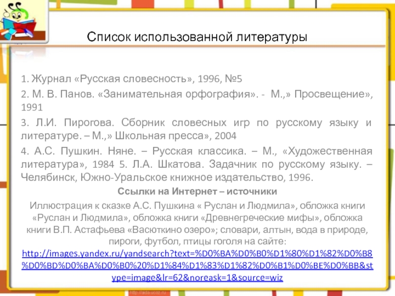 4. А.С. Пушкин. Няне. – Русская классика. – М., «Художественная литература», 1984 5. Л.А. Шкатова. Задачник по русскому языку. – Челябинск, Южно-Уральское книжное издательство, 1996.