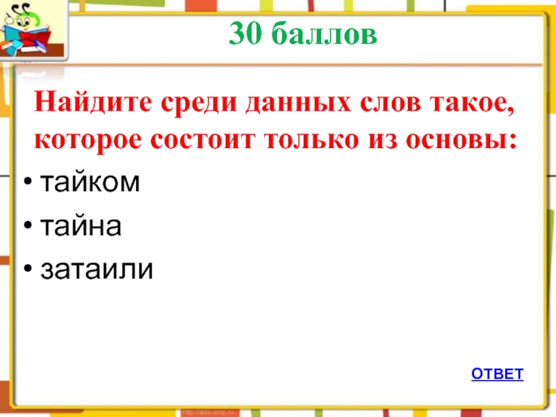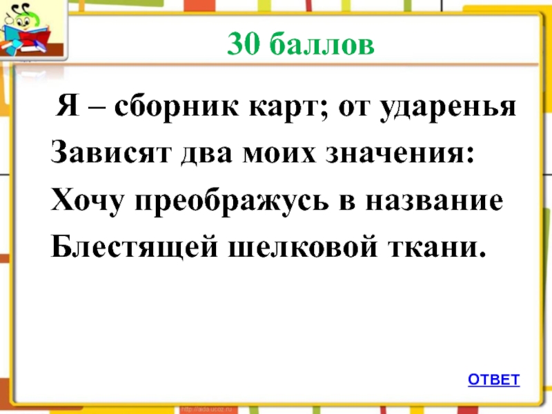 30 баллов  Я – сборник карт; от ударенья Зависят два моих значения: Хочу преображусь в название
