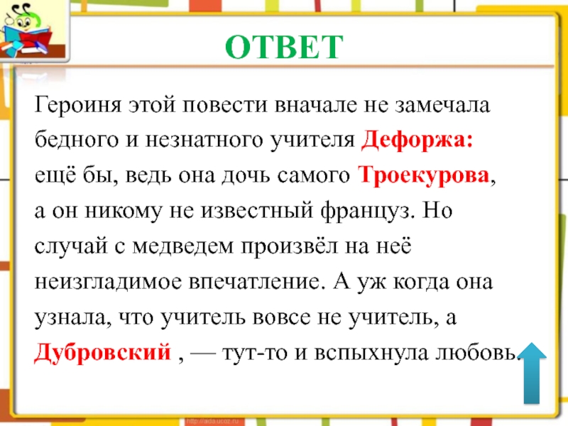 ОТВЕТГероиня этой повести вначале не замечалабедного и незнатного учителя Дефоржа:ещё бы, ведь она дочь самого Троекурова, а