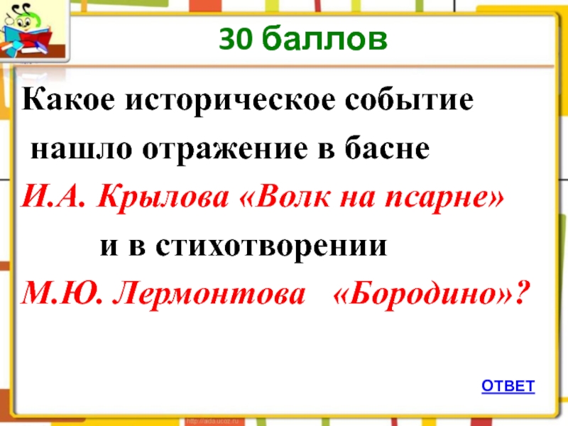 30 балловОТВЕТКакое историческое событие нашло отражение в басне И.А. Крылова «Волк на псарне»