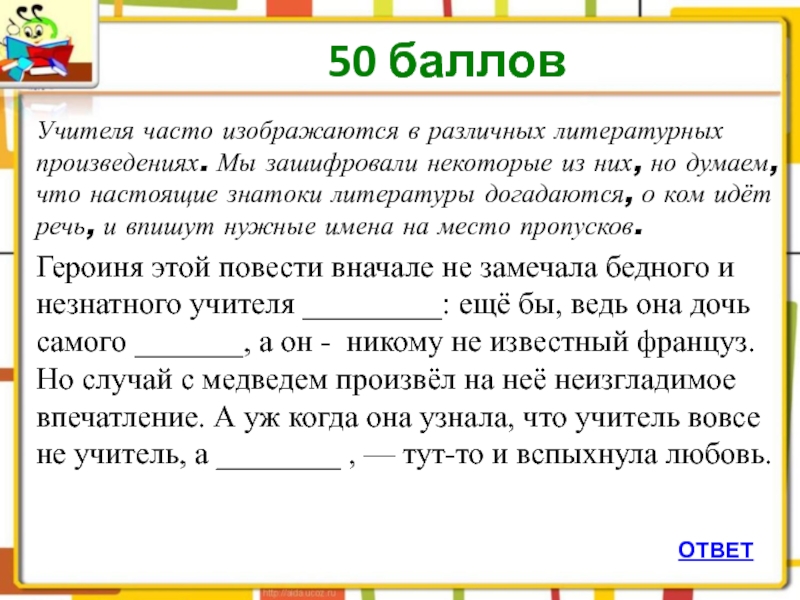 Слайд 51Учителя часто изображаются в различных литературных произведениях. Мы зашифровали некоторые