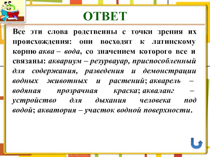 ОТВЕТВсе эти слова родственны с точки зрения их происхождения: они восходят к латинскому корню аква – вода, со значением