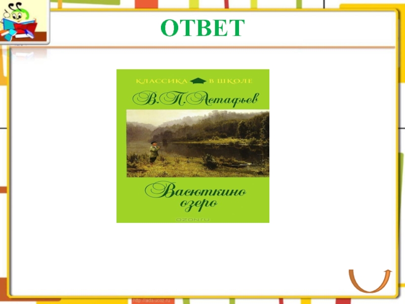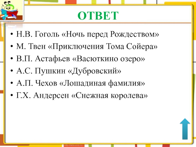 ОТВЕТН.В. Гоголь «Ночь перед Рождеством»М. Твен «Приключения Тома Сойера»В.П. Астафьев «Васюткино озеро»А.С. Пушкин «Дубровский»А.П. Чехов «Лошадиная фамилия»Г.Х.