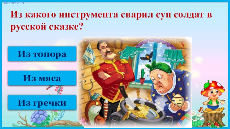 Из топораИз мясаИз гречки Из какого инструмента сварил суп солдат в русской сказке?