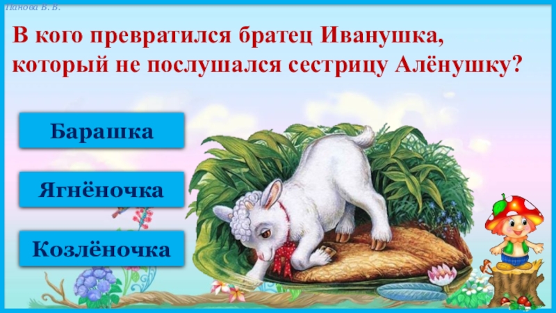 БарашкаЯгнёночкаКозлёночкаВ кого превратился братец Иванушка, который не послушался сестрицу Алёнушку?