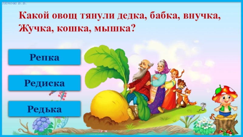 РепкаРедискаРедькаКакой овощ тянули дедка, бабка, внучка, Жучка, кошка, мышка?