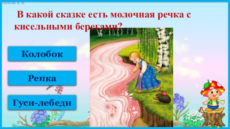 КолобокРепкаГуси-лебеди В какой сказке есть молочная речка с кисельными берегами?