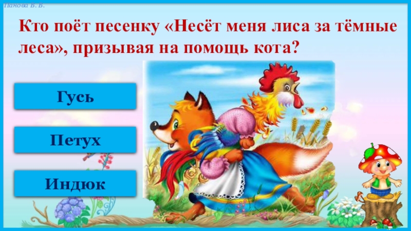 ГусьПетухИндюкКто поёт песенку «Несёт меня лиса за тёмные леса», призывая на помощь кота?