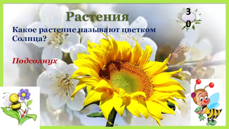 ПодсолнухКакое растение называют цветком Солнца?30Растения