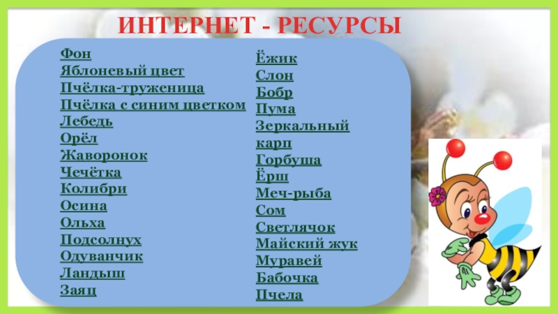 ИНТЕРНЕТ - РЕСУРСЫФонЯблоневый цветПчёлка-труженицаПчёлка с синим цветкомЛебедьОрёлЖаворонокЧечёткаКолибриОсинаОльхаПодсолнухОдуванчикЛандышЗаяцЁжикСлонБобрПумаЗеркальный карпГорбушаЁршМеч-рыба СомСветлячок Майский жук Муравей Бабочка Пчела