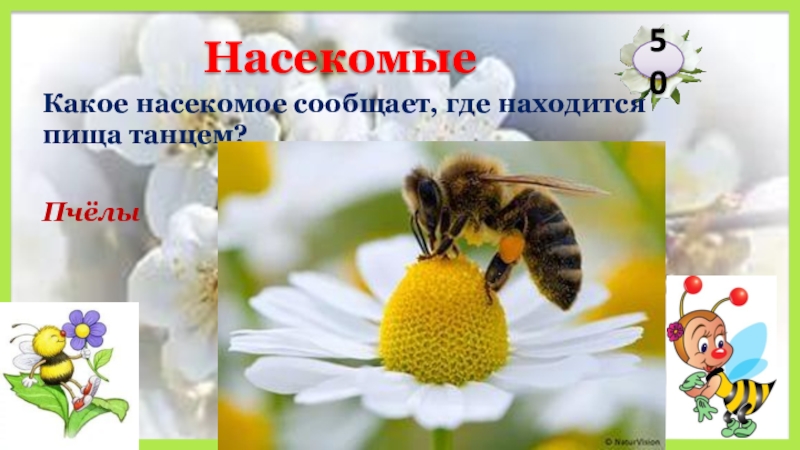 ПчёлыКакое насекомое сообщает, где находится пища танцем?50Насекомые