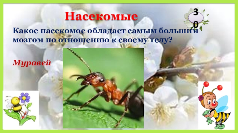МуравейКакое насекомое обладает самым большим мозгом по отношению к своему телу?30Насекомые