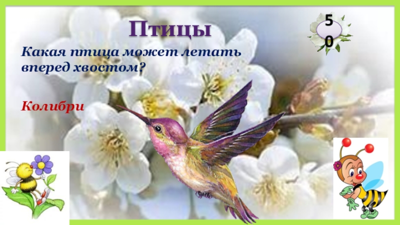КолибриКакая птица может летать вперед хвостом?50Птицы