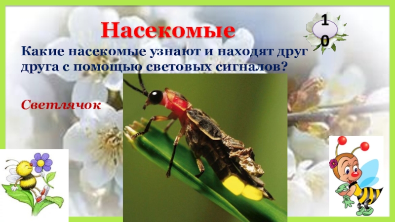 СветлячокКакие насекомые узнают и находят друг друга с помощью световых сигналов?10Насекомые