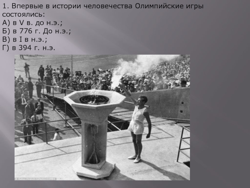 1. Впервые в истории человечества Олимпийские игры состоялись:А) в V в. до н.э.;Б) в 776 г. До н.э.;В) в I в н.э.;Г) в 394 г. н.э.