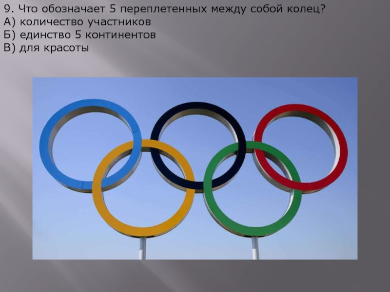 9. Что обозначает 5 переплетенных между собой колец?А) количество участниковБ) единство 5 континентовВ) для красоты