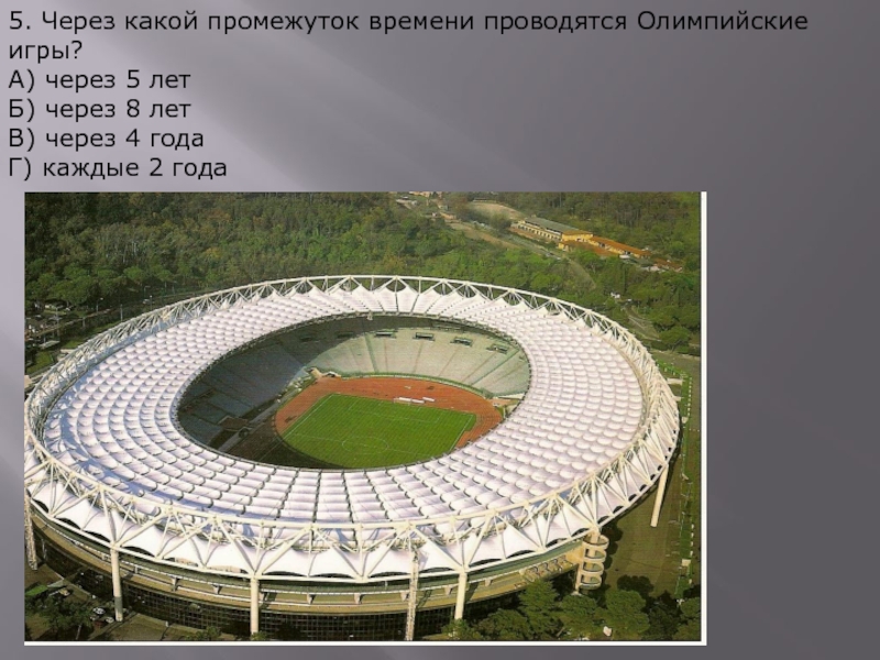 5. Через какой промежуток времени проводятся Олимпийские игры?А) через 5 летБ) через 8 летВ) через 4 годаГ)