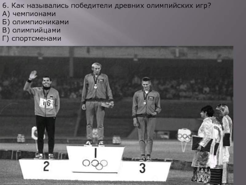 6. Как назывались победители древних олимпийских игр?А) чемпионамиБ) олимпионикамиВ) олимпийцамиГ) спортсменами