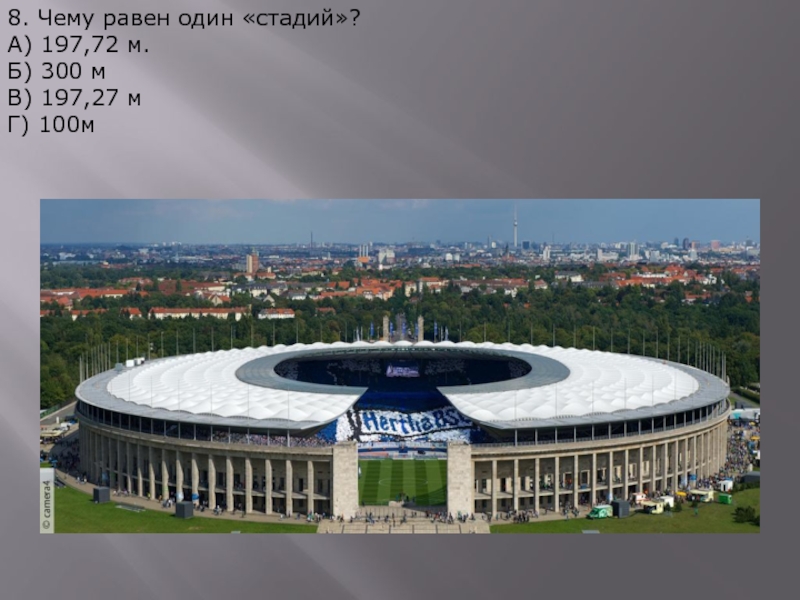 8. Чему равен один «стадий»?А) 197,72 м.Б) 300 мВ) 197,27 мГ) 100м