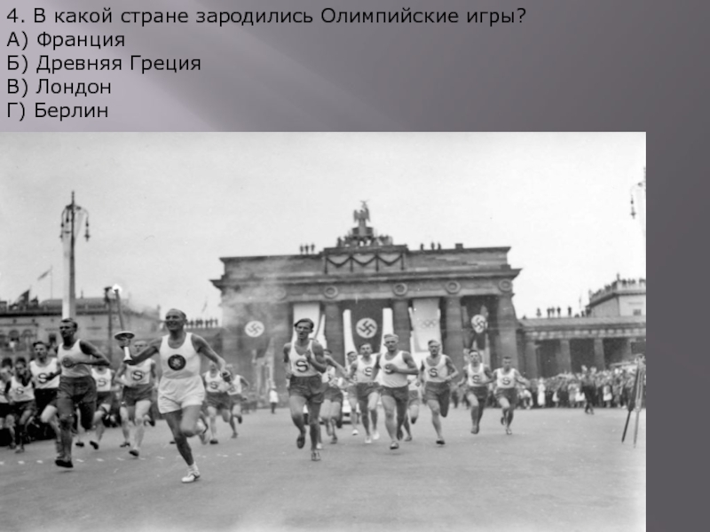 4. В какой стране зародились Олимпийские игры?А) ФранцияБ) Древняя ГрецияВ) ЛондонГ) Берлин
