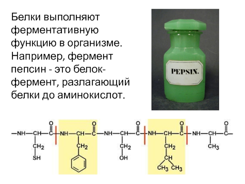 Слайд 5Белки выполняют ферментативную функцию в организме. Например, фермент пепсин -