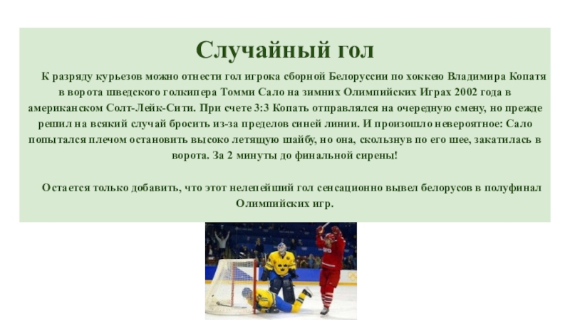 по хоккею Владимира Копатя в ворота шведского голкипера Томми Сало