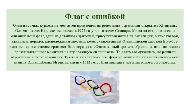 в японском Саппоро. Когда на стадион внесли олимпийский флаг, один из дотошных зрителей, присутствовавших на репетиции, мягко говоря, удивился: порядок расположения цветных колец, узаконенный Олимпийской хартией (голубое-желтое-черное-зеленое-красное), был перепутан. Озадаченный зритель обратил внимание членов организационного комитета на эту досадную оплошность. Те долго возмущались, но решили обратиться к первоисточнику. Тут-то и выяснилось, что флаг «с ошибкой» вывешивался на всех зимних Олимпийских Играх начиная с 1952 года. И за двадцать лет никто ничего не заметил.