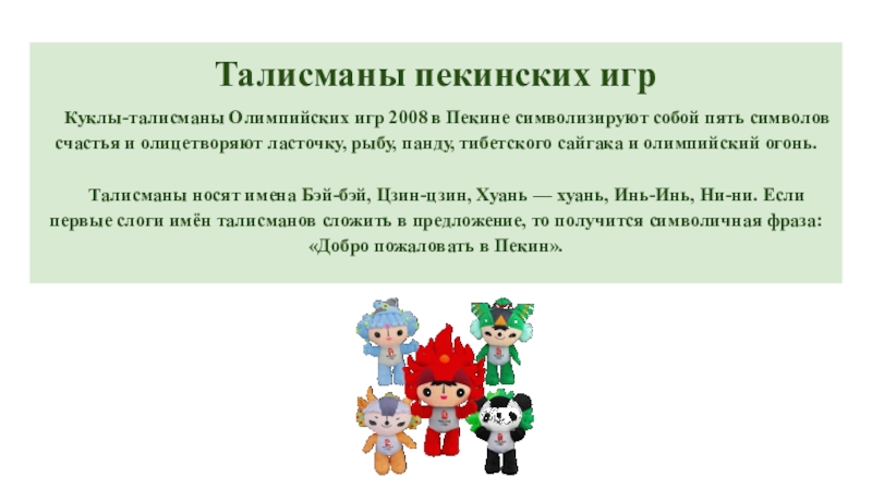 Куклы-талисманы Олимпийских игр 2008 в Пекине символизируют собой
