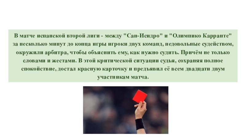 недовольные судейством, окружили арбитра, чтобы объяснить ему, как нужно судить. Причём не только словами и жестами. В этой критической ситуации судья, сохраняя полное спокойствие, достал красную карточку и предъявил её всем двадцати двум участникам матча.
