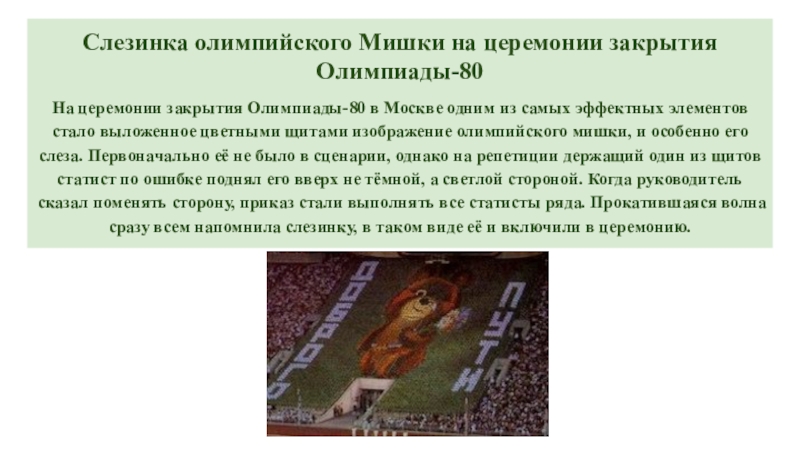 Слайд 16Слезинка олимпийского Мишки на церемонии закрытия Олимпиады-80