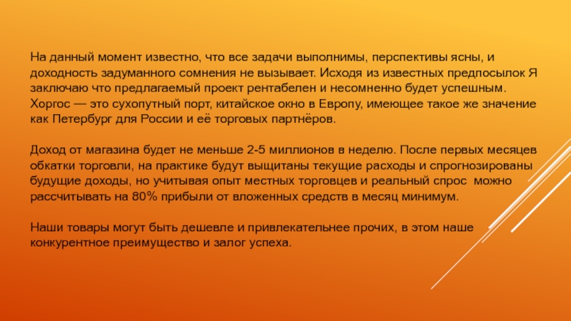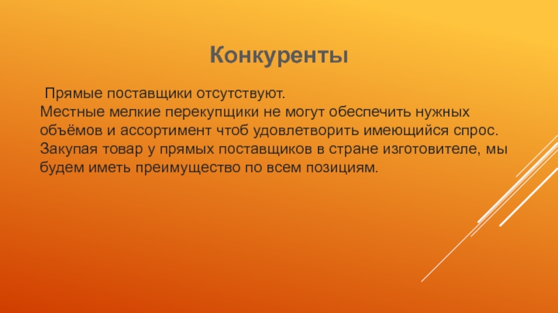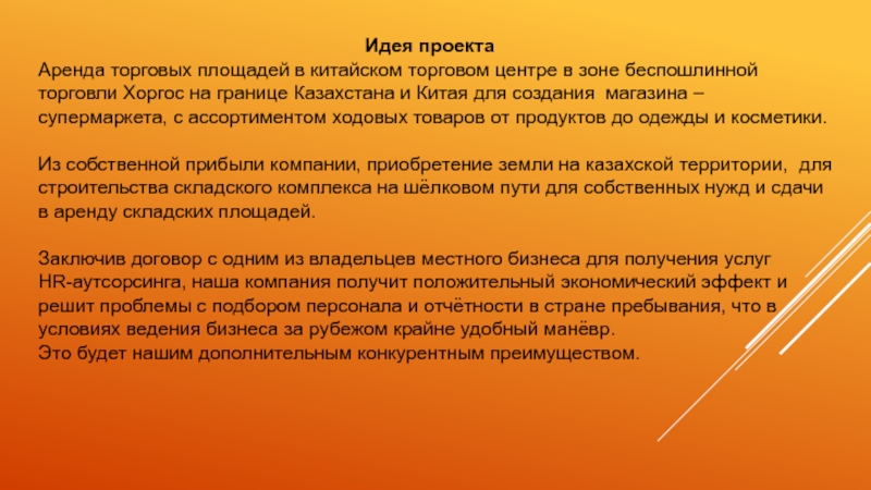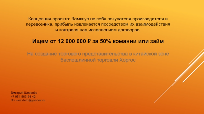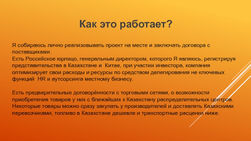 Концепция торговли проста и прозрачна, получив финансирование и торговые площади, после их оборудования и подготовки к открытию, закупаем товары и приступаем к их реализации.