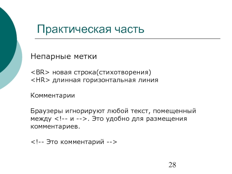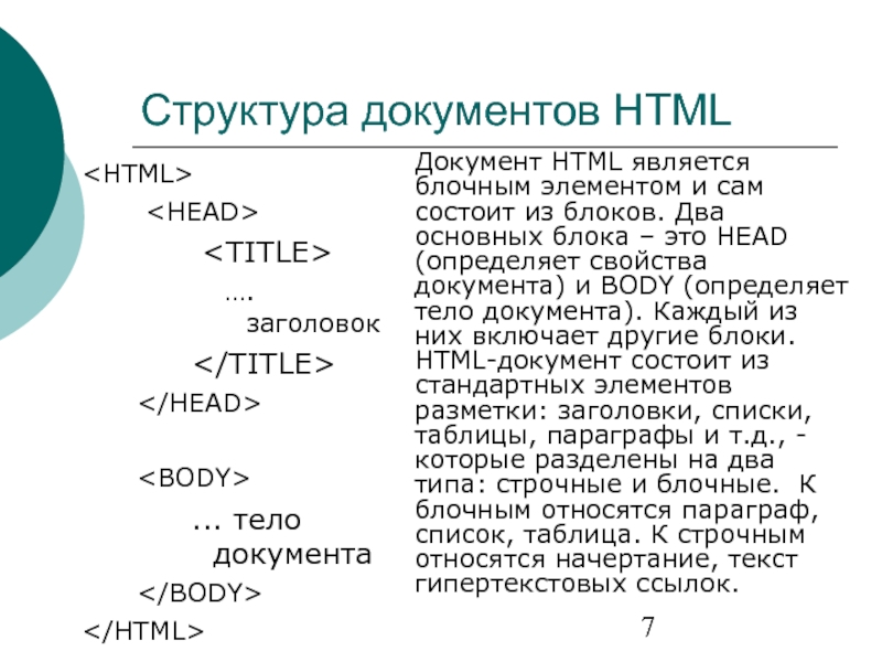 это HEAD (определяет свойства документа) и BODY (определяет тело документа). Каждый из них включает другие блоки. HTML-документ состоит из стандартных элементов разметки: заголовки, списки, таблицы, параграфы и т.д., - которые разделены на два типа: строчные и блочные. К блочным относятся параграф, список, таблица. К строчным относятся начертание, текст гипертекстовых ссылок.