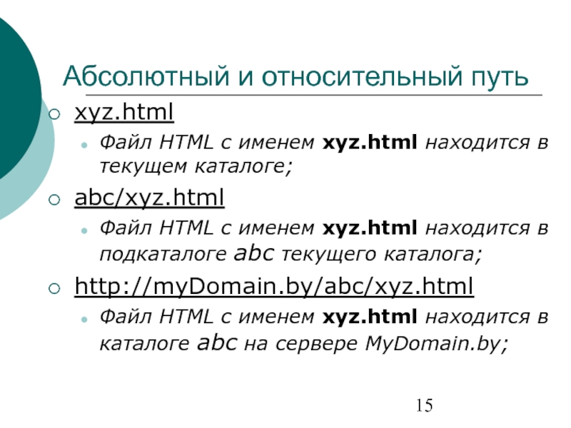 абсолютная ссылка – полный путь к файлу с указанием доменного адреса узла и пути к файлу на данному узле.
