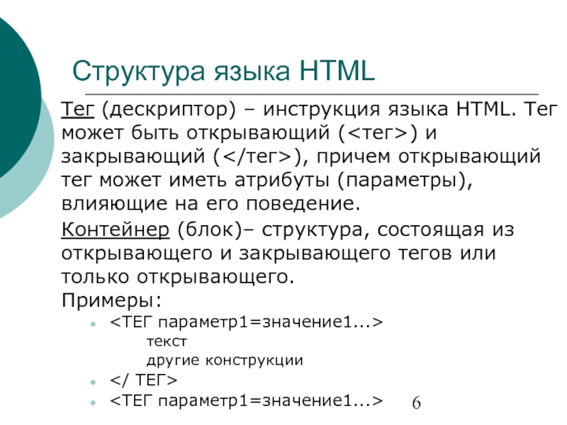 Тег (дескриптор) – инструкция языка HTML. Тег может