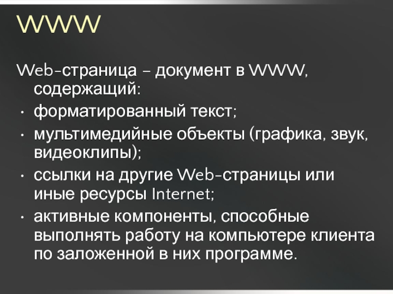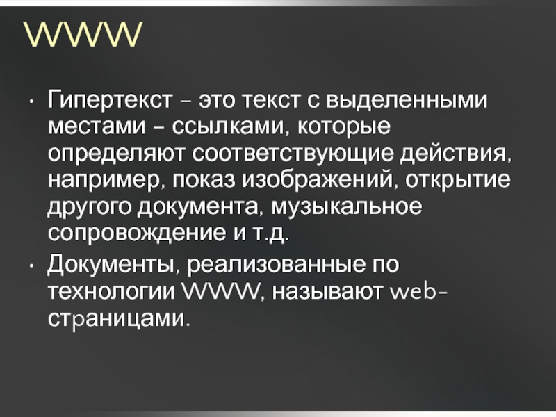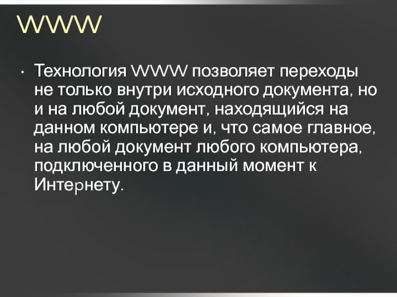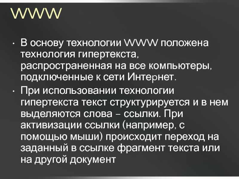 В основу технологии WWW положена технология гипертекста, распространенная на все