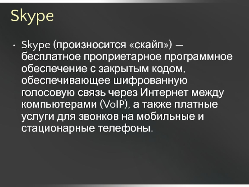 Skype (произносится «скайп») — бесплатное проприетарное программное обеспечение с закрытым