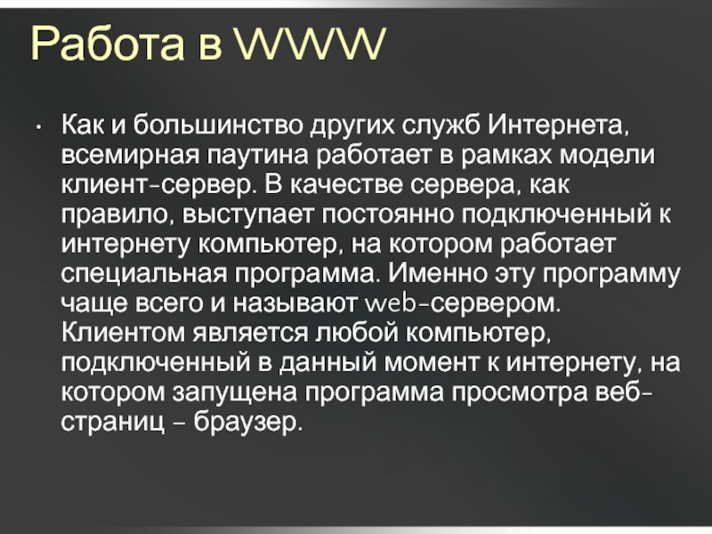 выступает постоянно подключенный к интернету компьютер, на котором работает специальная программа. Именно эту программу чаще всего и называют web-сервером. Клиентом является любой компьютер, подключенный в данный момент к интернету, на котором запущена программа просмотра веб-страниц – браузер.