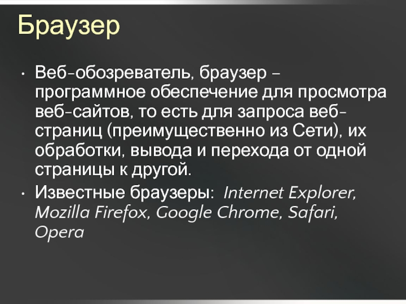 Известные браузеры: Internet Explorer, Mozilla Firefox, Google Chrome, Safari, Opera