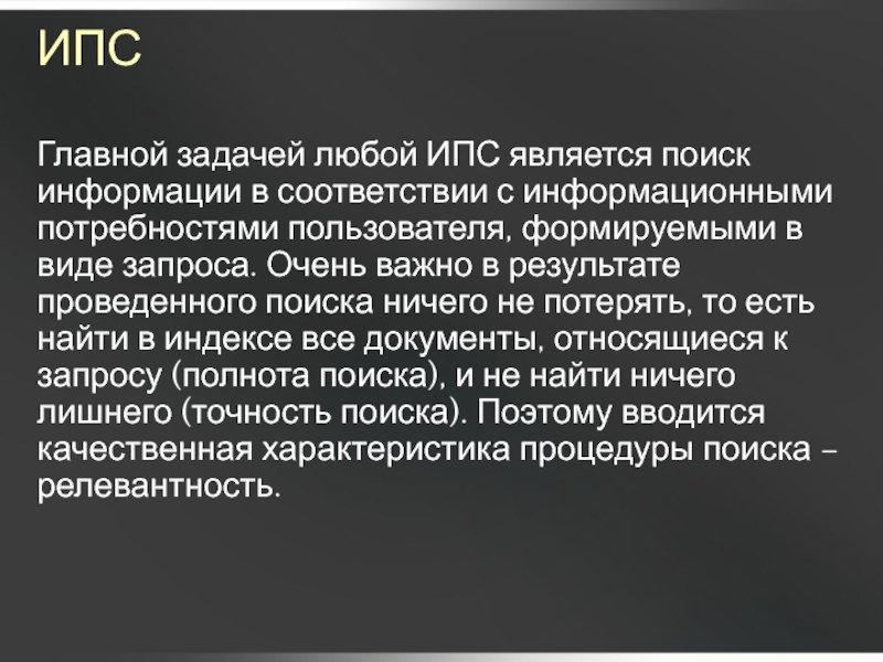 Главной задачей любой ИПС является поиск информации в соответствии с