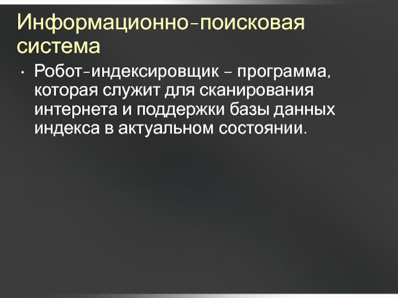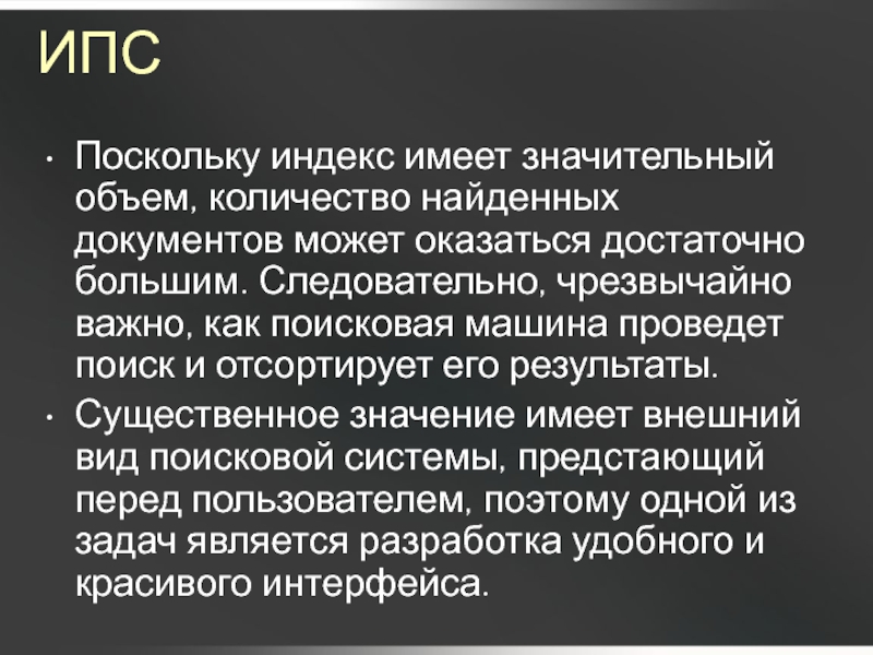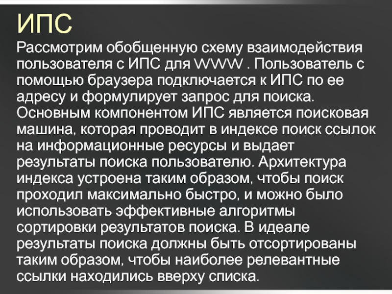 и формулирует запрос для поиска. Основным компонентом ИПС является поисковая машина, которая проводит в индексе поиск ссылок на информационные ресурсы и выдает результаты поиска пользователю. Архитектура индекса устроена таким образом, чтобы поиск проходил максимально быстро, и можно было использовать эффективные алгоритмы сортировки результатов поиска. В идеале результаты поиска должны быть отсортированы таким образом, чтобы наиболее релевантные ссылки находились вверху списка.
