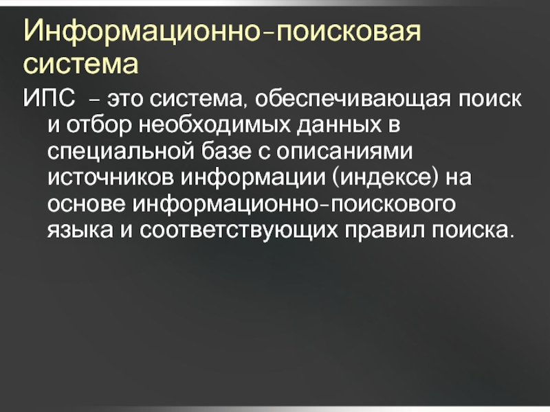 ИПС – это система, обеспечивающая поиск и отбор необходимых