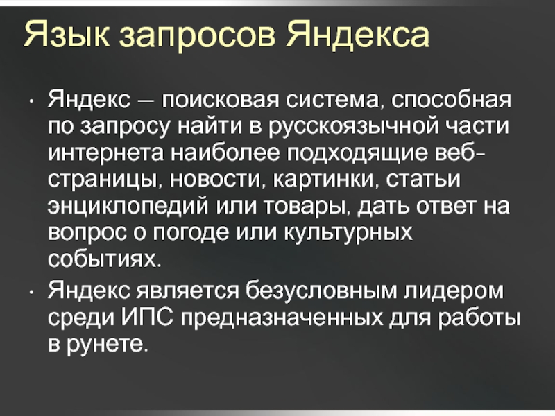 Яндекс является безусловным лидером среди ИПС предназначенных для работы в рунете.