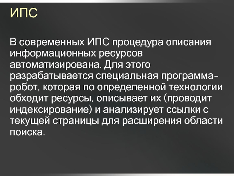 В современных ИПС процедура описания информационных ресурсов автоматизирована. Для этого