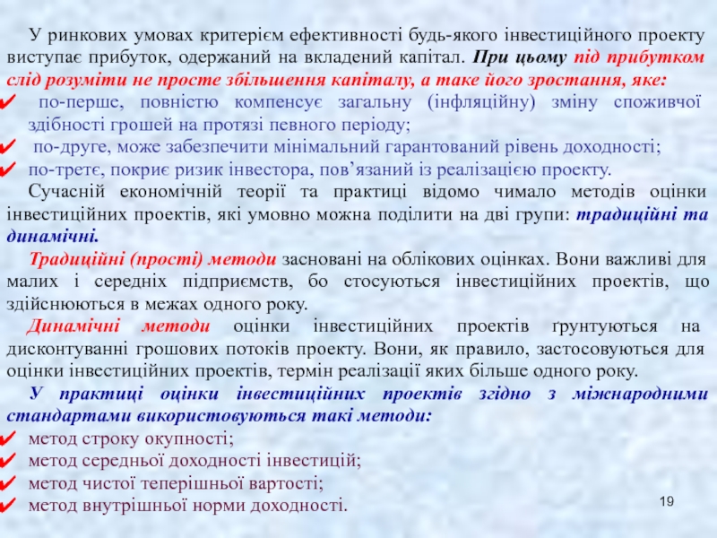 Слайд 19У ринкових умовах критерієм ефективності будь-якого інвестиційного проекту виступає прибуток,
