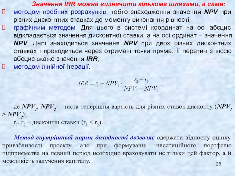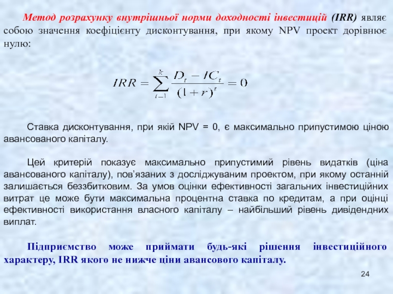 Слайд 24Метод розрахунку внутрішньої норми доходності інвестицій (IRR) являє собою значення