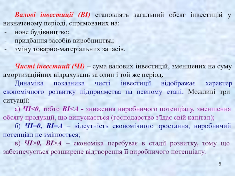 Слайд 5Валові інвестиції (ВІ) становлять загальний обсяг інвестицій у визначеному періоді,