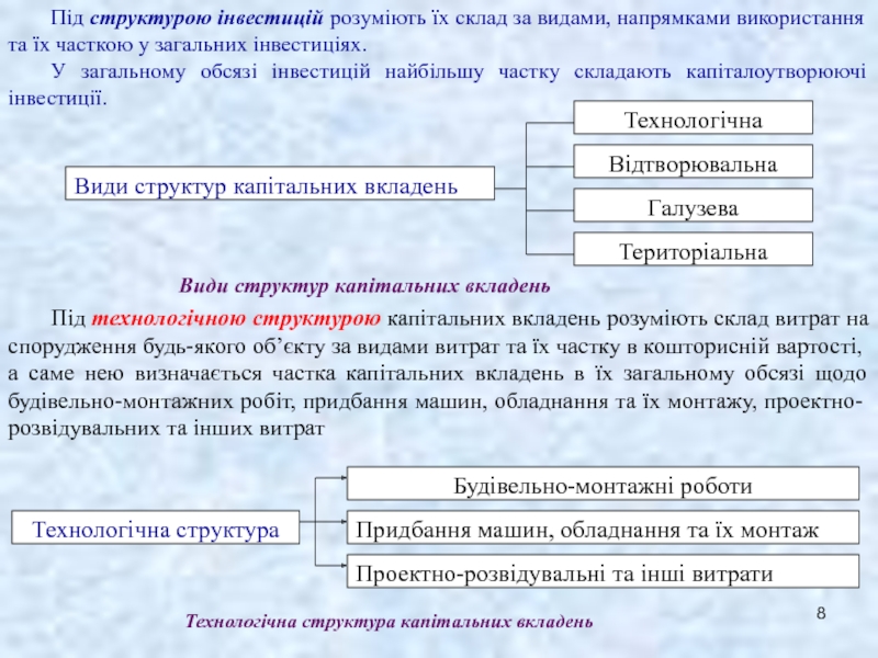 Слайд 8Під структурою інвестицій розуміють їх склад за видами, напрямками використання