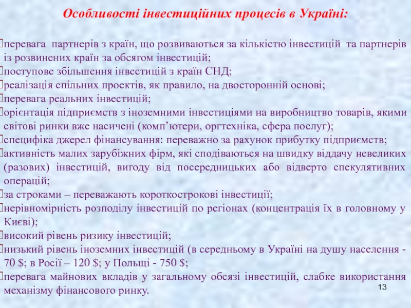 Слайд 13Особливості інвестиційних процесів в Україні: