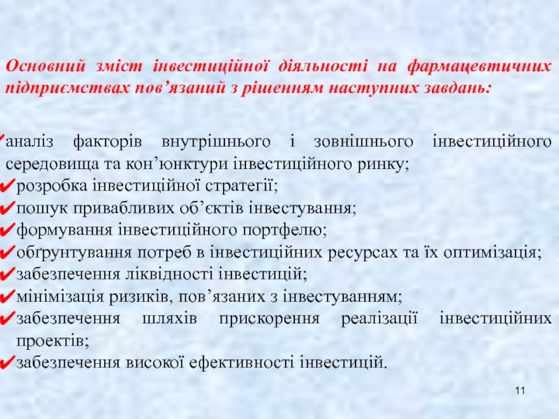 Слайд 11Основний зміст інвестиційної діяльності на фармацевтичних підприємствах пов’язаний з рішенням