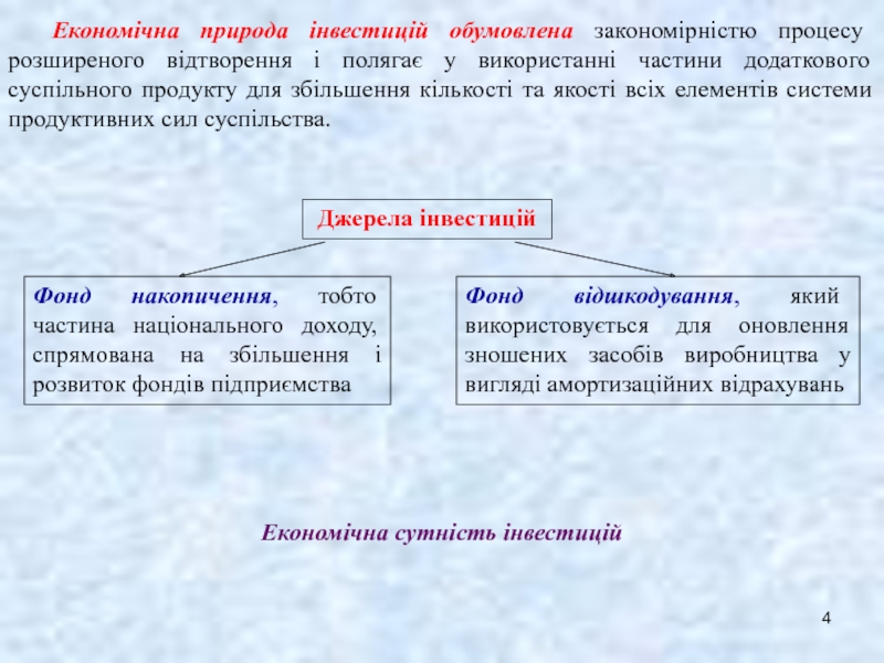 Слайд 4Економічна природа інвестицій обумовлена закономірністю процесу розширеного відтворення і полягає